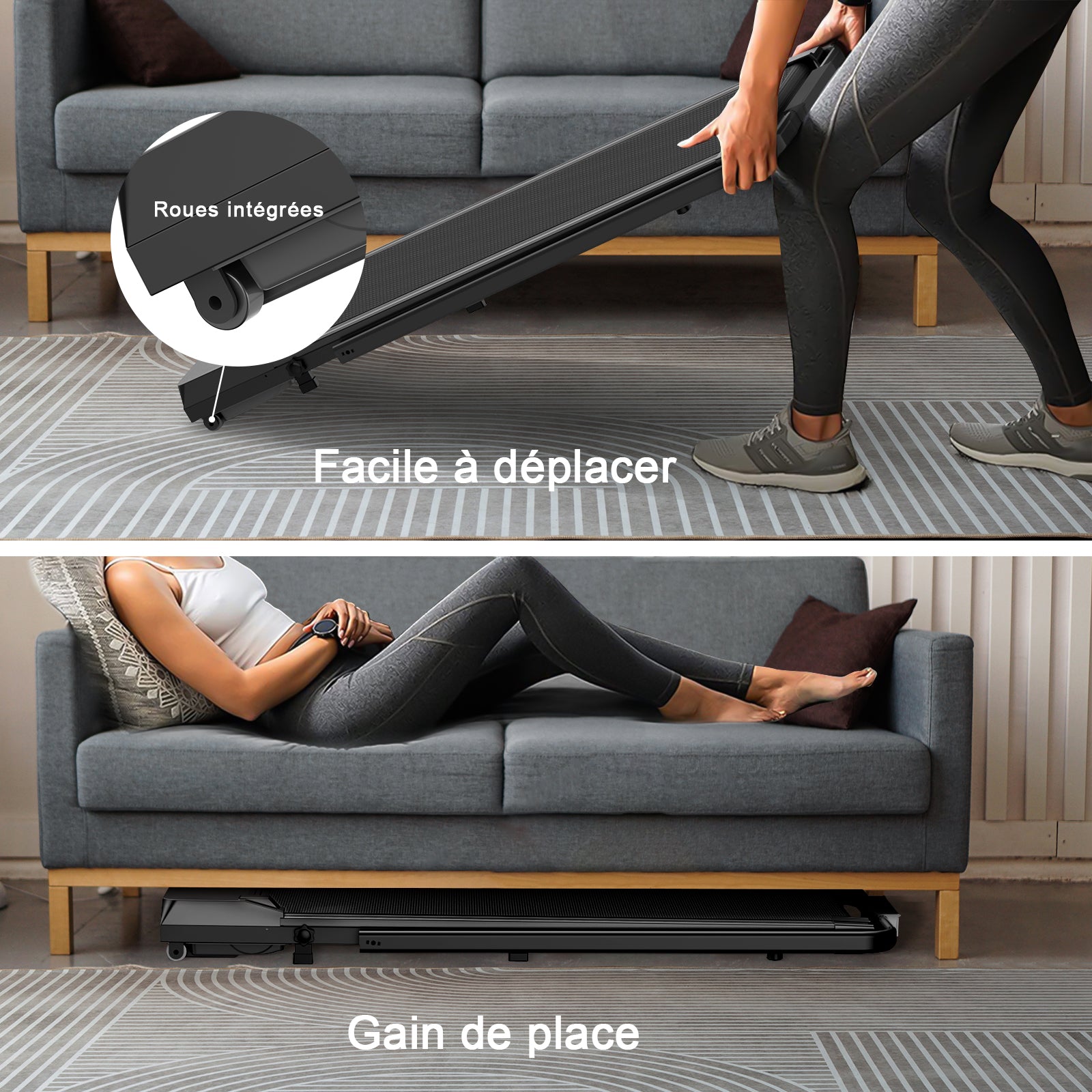 Notre tapis de marche compact convient parfaitement aux petits espaces comme la maison, le bureau ou l'appartement. Les deux roues intégrées vous permettent de le déplacer partout ou de le ranger debout contre le mur pour libérer de l'espace dans votre pièce.